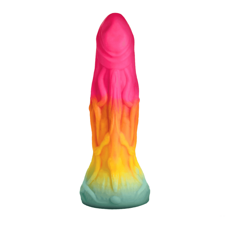 The Shape Shifter is a chimera come to life — an 8 inch rainbow shaft crawling with ropey, crossing veins and crowned by a wrinkled, monstrous head. Just beneath it, a small beaked lizard clings tight, arms outstretched as if anchoring you to every thrust. With its bright swirl of pink, orange, yellow, and teal, this alien rod looks like a carnival ride from another dimension — and it feels just as wild inside. Thick, textured, and brutally playful, the Shape Shifter transforms ordinary play into full-on body horror bliss.
